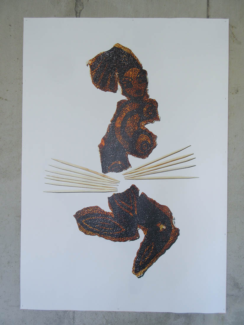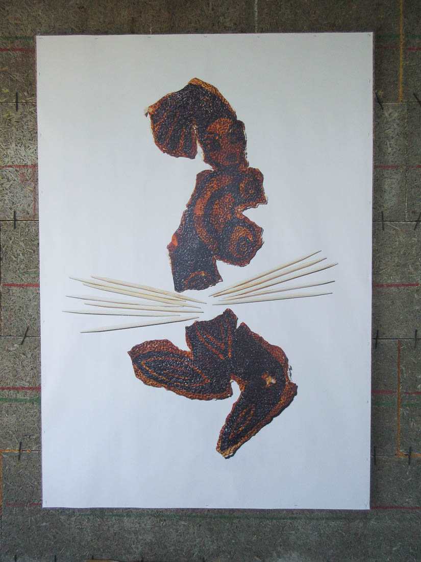 Photography, drawing on orange peel in 2004, toothpicks, Ink print on paper, 140 x 200 cm (55.1 x 78.74 in.)